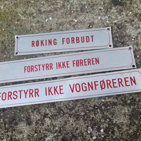 Eldre skilt med emalje og med teksten "Nicht öffnen bevor der Zug hält" («ikke åpne før toget stopper»). Måler 35 x 7 cm. Se bilder.