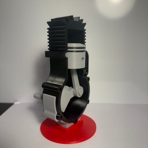 Stempel og ventil beveger seg og lys indikerer tenning, med lyd, drives av en liten elektromotor.
