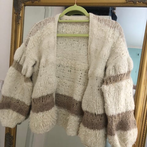 Line Langmo strikkejakke, mønster «70-tallsjakke». Kun brukt noen få ganger. Hjemmestrikket i Line Langmo påfugl-garn, farge «lys denim».
