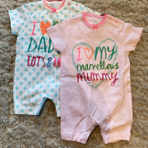 Baby nyfødt klespakke med ny klær med lappen på.