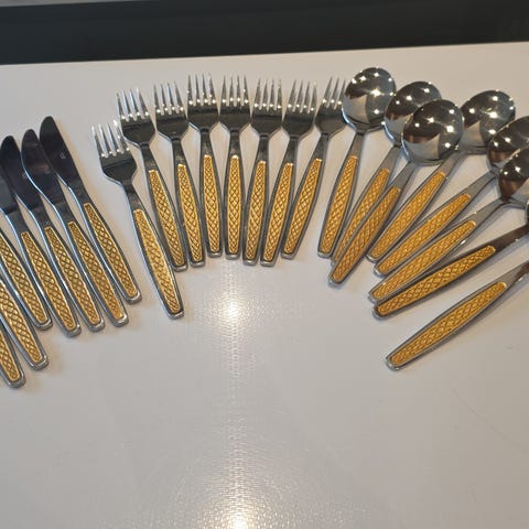 Selger ulike sett med fargerikt bestikk rimelig.