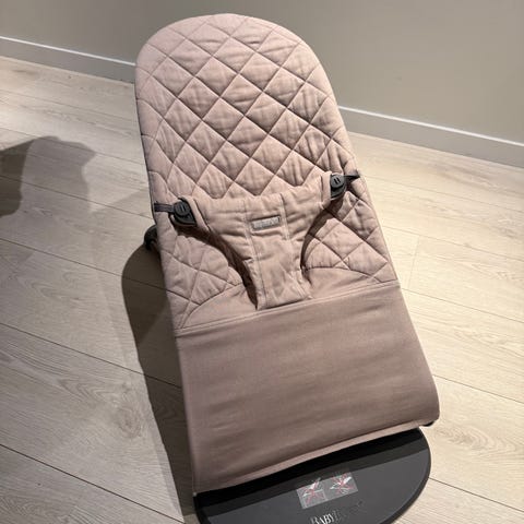 Svært pent brukt vippestol selges. Vår baby likte den aldri, så den er knapt benyttet. Trekket er vasket og den er klar til bruk. Ingen synlige merker, og alt er i orden. Trekker er fargen støvrosa, og den har et quiltet bladmønster. Ny pris rundt 1800,- til 2000,-