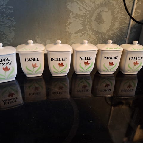 6 krydderbokser fra Egesund fajanse selges. De er hele og uskadde men noe krakelering i glasuren.