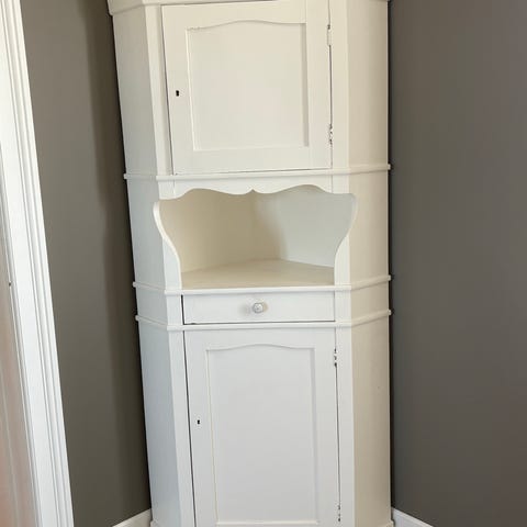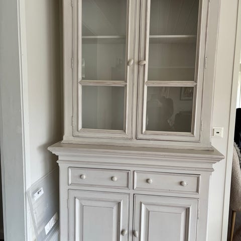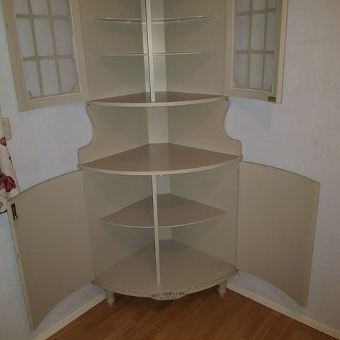 Dette er et hjørneskap i klassisk gustaviansk stil med to glassdører øverst og et lukket skap nederst. Skapet har en buet utforming, sukkerbitkant, og er egnet for plassering i hjørner for oppbevaring