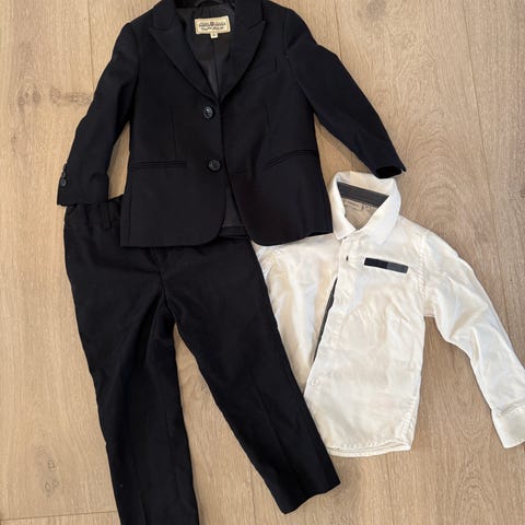 Selger en ubrukt blazer/dressjakke med en medfølgende hvit skjorte. Veldig god kvalitet på blazeren. Det står at den er str.3 hvilket jeg antar betyr at den egner seg for ca 3 år. Jeg kjøpte den for å ha den i tilfelle det var noen festligheter vi måtte kle oss litt ordentlig i, men det ble ikke noe av og er derfor ikke brukt. Perfekt til 17. mai eller i konfirmasjon, bryllup og lignende :)