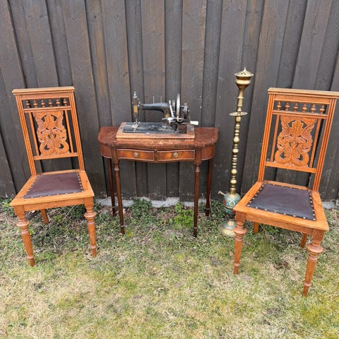 Spesiell, unik og ubetydelig brukt gyllenlær/gyldenlær stol i mørk utskåret eik selges. Nydelig og faglig utført håndverk. Ingen bruksmerker.