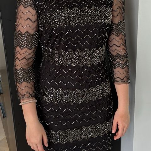 Knelang svart kjole med glittereffekt. Stretch. Pent brukt. Fint for julebord.