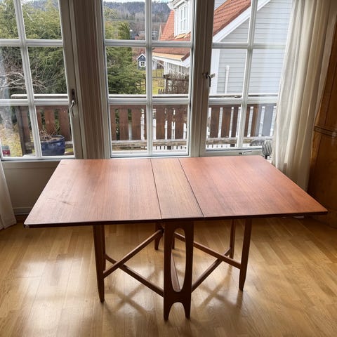 Teak klaffebord design Bendt Winge. Bordet har to klaffer hver på 64 cm. Sammenslått bredde er 34 cm. Bordet kan brukes med en eller to klaffer. Bredde med en klaff 98 cm. og med begge klaffer 162 cm. Høyde 74 cm. Bordet er nypusset og oljet og fremstår som meget pen og i god stand med minimal bruksmerker. Nydelig mønster/glød i teaken (se bilder). Flott Norsk design fra 60-tallet.