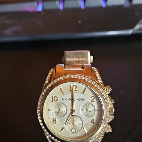 Pent brukt dameklokke i bonsefarge med små diamanter rundt, klokka har en liten skrape i glasset på toppen, IKKE godt synlig.
