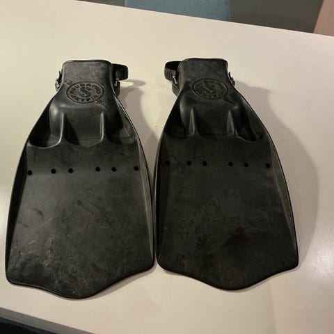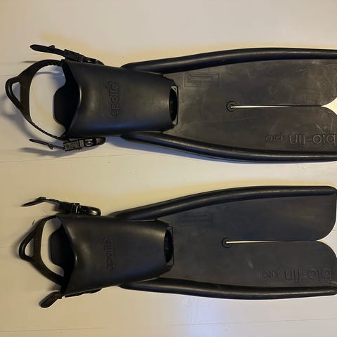 Nesten ubrukte svømmeføtter i str. L. God kraft i frasparket, og du kan gå med dem på land.