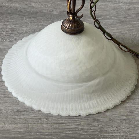 Vintage taklampe med svakt fargede glassplater, blomsterdetaljer i glasset og gullfarget metall. Se bilder for bedre beskrivelse. Ledningen er ikke jordet.