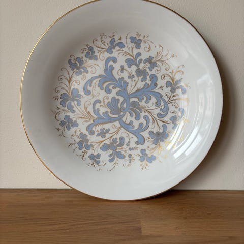 Dekorativt fat i serien Seljord fra Porsgrund Porselen, design Torstein Rønjom. Mål 27,5 cm. Kan brukes som fat, eller som veggpynt.