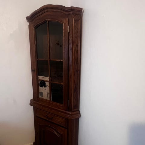 Et nydelig, solid treverk skap med 2 hylle inne og 4 små skuffer.
