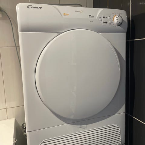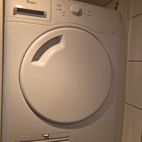 Tørketrommel som har stått i flere år uten å ha vært brukt. Den er defekt, men har tidligere vært reparert for samme feil flere ganger. Sannsynligvis er det samme del som må byttes igjen (husker ikke delenavn).