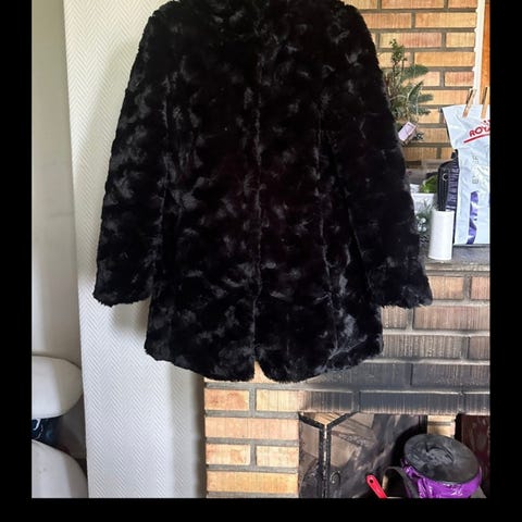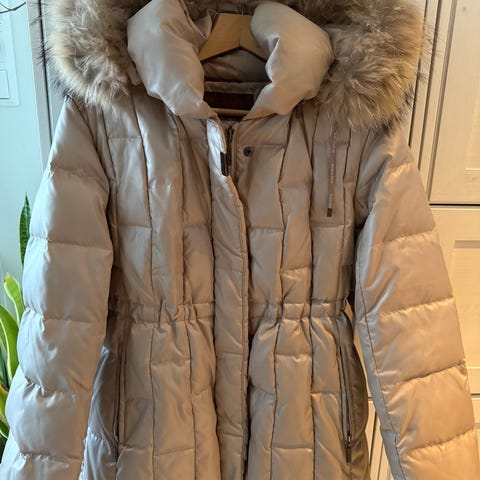 Supervarm grå jakke med kjempefin hette med fuskepels.