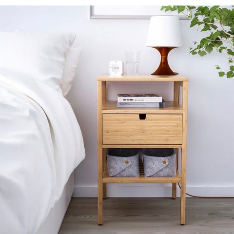 Skuffen og hyllen gir god plass til å holde mindre gjenstander organisert og innen rekkevidde. Nattbordet er laget av sterk kryssfiner og høykvalitets keisertre, som gjør det lett å rengjøre, samt meget slitesterk med lite vedlikehold.
