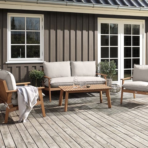 Sofaen er velegnet til både inne- og utendørsbruk. Ved utendørs bruk kan man olje teaken en gang i året, dermed bevares utseendet best.