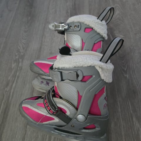 Skøyter med justerbar størrelse på skoen selges. Et knapp på siden regulerer størrelsen fra 33-36.