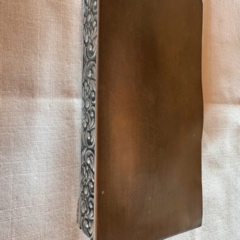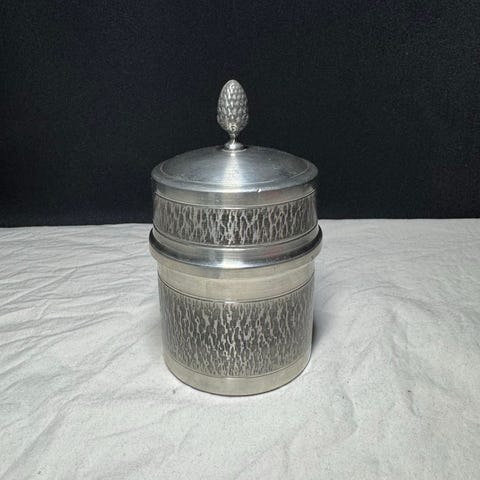 Lite sigarettskrin i tinn med troll på lokket. Høyde er 12 cm / diameter 7 cm. Inngravert med "Arne".