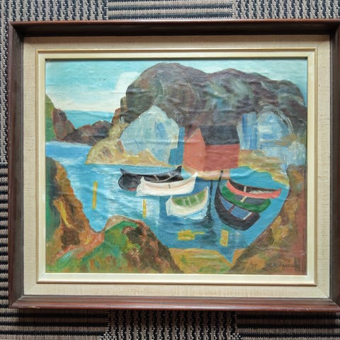 En liten periode bodde han i anekset hos min mor som hadde hus i Søgne. Da malte han bl.a. disse to. Jeg har nå arvet dem og de fortjener å henge oppe, men jeg har alt for få vegger og for mange malerier!