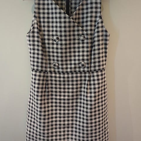 Blå og hvit prikkete minikjole fra Bikbok, med dekorative gullknapper foran. Behagelig stoff med mye stretch.