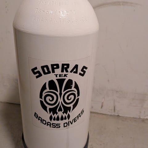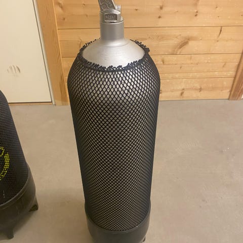 Dykkerflaske i stål fra 1999. Ikke brukt siden 2000 så den må kontrolleres og renses ved behov. Den har uansett stått med trykk på hele tiden og har fortsatt overtrykk. Usikker på spesifikasjonen så spør hvis det er noe man lurer på. Det følger med et litt slitt bærenett.