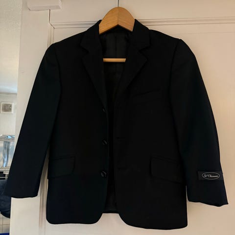 Eksklusiv crested Burberry blazer/jakke i ull med rødt silkefór. Lomme med Burberry-emblem/crest. Str. 14 år. Meget pent brukt. Perfekt til jul, 17. mai, konfirmasjon, juletiden, og alle andre festlige og formelle sammenkomster.🇳🇴Har Ralph Lauren Polo-slips i ull/silke og italiensk dressbukse i 100-ull som passer til.