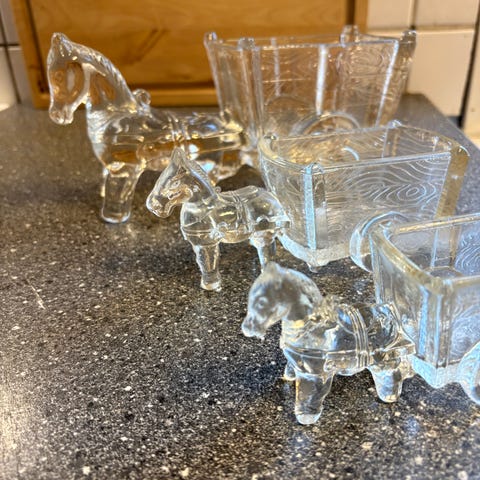 6 flotte Drammeglass fra Sildakongen 1985 , Norsk design. Mønster i fiskeskjell, ble brukt til å reklamere for bedriften. Kan også brukes til eggeglass.