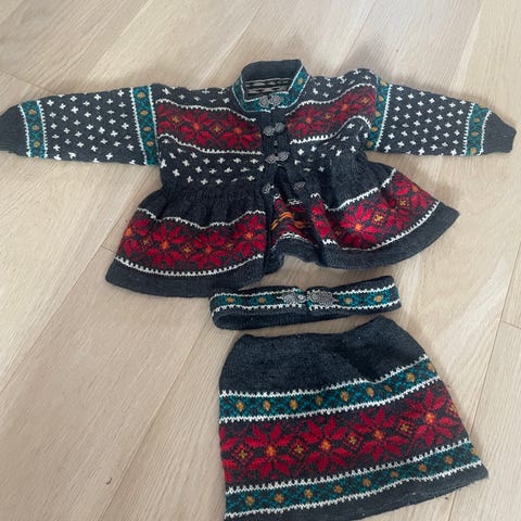 Barnekjole 5 - 7 år. ..Hei lengde er 65 cm og bredde 24 cm .. strikket i Bjørk garn og nedre del i boblemønster.