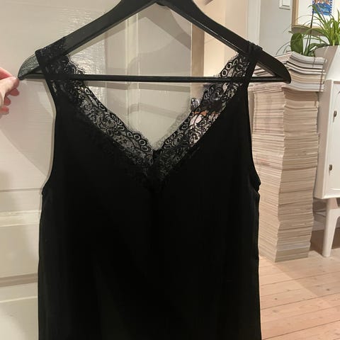 Pen, sort topp med tynne stropper og volanger på brystet. Str. S. Kort, luftig og pen topp.