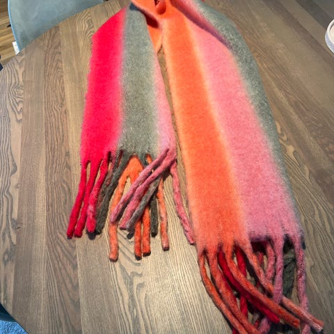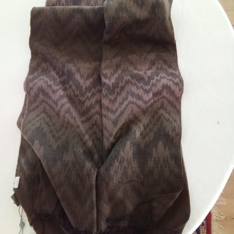Pent til brun evt burgunder blazer. Nytt ubrukt pent dobbelt skjerf/sjal med frynser fra Sassymanii. 100% polyester. Krøllfritt. Røyk- og dyrefritt. Selger kr.200,-. Pris er satt.