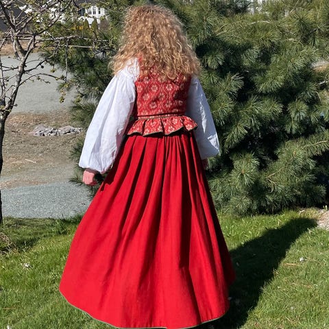 Orkdalsbunad selges. Vesten er max sydd ut og jeg vil si den nå tilsvarer en størrelse S. Passer lengde 1.65-1.70. Lue og to sjal følger med