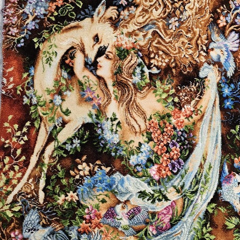 Materialer: Ull og silke på bomullsrenning, syntetiske farger Knutetetthet: Ca. 300 000 knuter per m2 Alder: ca. 2000-2005