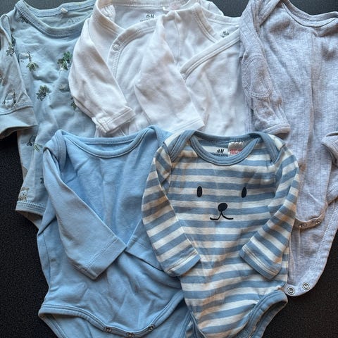 6 bodier med korte ermer, 8 bodier med lange ermer, 6 pysjamas, 1 tjukk bomullsdress fra Hust & Clair som passer perfekt til kjølige sommedager, 2 luer, 3 par sokker og 1 par antiklore votter (Tynne votter uten tommel som hindrer at babyen din klorer seg selv i ansiktet)