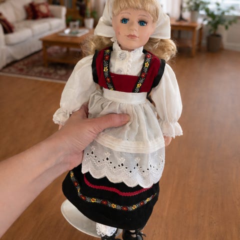 Med grå kjole: Høyde 32 cm. Kr 150,-