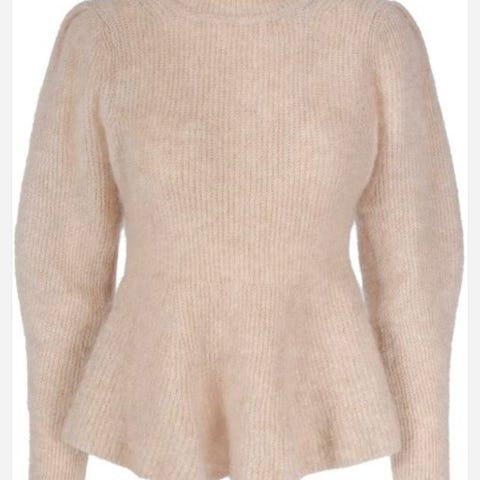 "Spell" fra Arnie Says. En feminim strikkegenser i beigemelert farge. Genseren har høy hals og lange ballongermer med brede mansjetter. Modellen har innsving i midjen før den skrår ut i A-fasong. Puff-effekt i skuldre. Den kommer i myk og god mohair kvalitet.