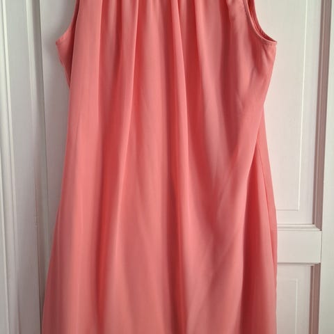 Nydelig stroppeløs kjole i rosa chiffon. Flettet gullbelte. Strikk oppe og i livet. Litt lengre bak. Som ny, brukt en gang.