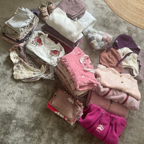 Klespakke med bodyer, bukser, luer, ullvotter, ulltøfler, solhatter, collegejakke, vinddress, bomullsdress, ulldress. Fra merker som bl a polarn o pyret, Joha.