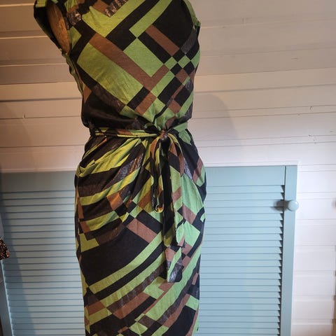 Søt skjortekjole med jungelprint og belte. Av det australske merket Leona Edmiston. Flatterende snitt og behagelig på. Aldri brukt. 95% polyester, 5 % spandex. Krøller minimalt, fin å ha i koffert/ til sommerferie.