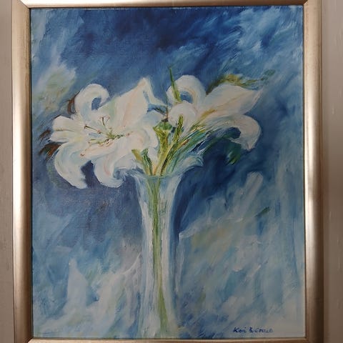 Dessverre 2 hull i lerretet, ikke forsøkt reparert.