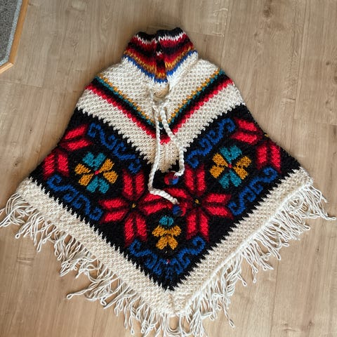 Superkul retro topp i blå med prikker. Passer alle str. Litt poncho aktig - sydd snitt for ermer.