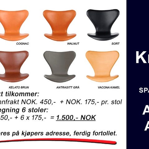 6 stk. Arne Jacobsen Syver stole modell 3107 ny polstret med anilinskinn. Normal pris 43.500,- - Tilbud 39.300.- SPAR 4.200,- KR.