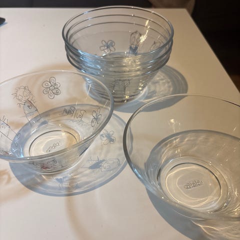 Stor salatbolle m/4 stk små salatskåler. Blomstermønster. Bollen måler: D: 28 cm, h: 14 cm. De små måler: D: 14 cm, h: 7 cm. Det er ikke brukt, kun pakket ut av emballasjen. Porto kommer i tillegg v/sending.