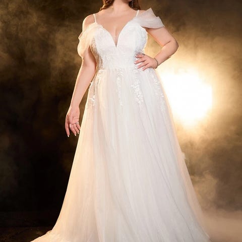Nydelig brudekjole, med sjal og slør.På bildet er ikke kjolen strammet inn, den kan bli smal rundt midje hvis ønskelig.Ny pris var 13000