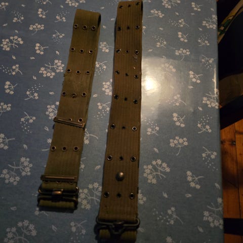 Belter fra Noa Noa og Solar. Fra venstre Blå belte i fløyel med blomst (solgt), silkebelte, belte med paljetter og belte i grønn semsket skinn med blomst er nå solgt. 50kr per stykk.
