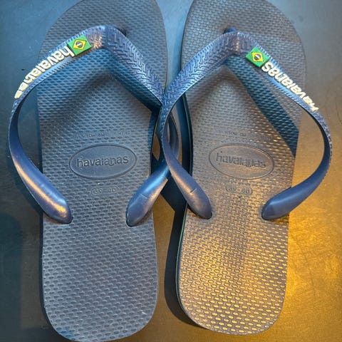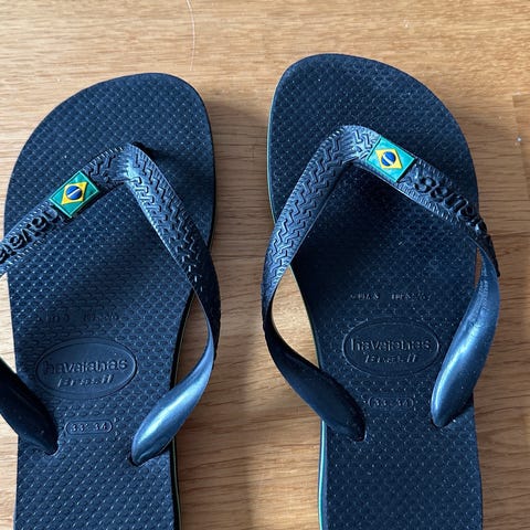 Meget pent brukte Havaianas i str. 33-34. Mørk blå med hvit logo og det brasilianske flagget. Brukt en kort sommersesong før de var for små. Supre strandsandaler.