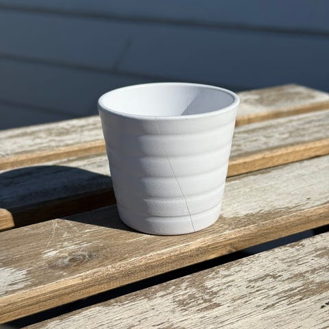 Hvit blomsterpotte til innendørsbruk. Diameter 10 cm og høyde 9 cm. Knapt brukt. Hentes på Lambertseter, sendes ikke.