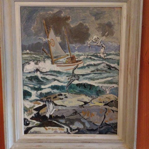 Olje maleri av kunstneren Marju Bormeister f. 22.12.1945 - kjøpt på Kunstauksjon i Tallinn i Estland i 2002. Lengde på ramme 76 cm og bredde 40 cm. Rammet inn på Stockmannist. Passer fint på en hytte eller ferieleilighet eller hjemme hos en glad fisker 🐠