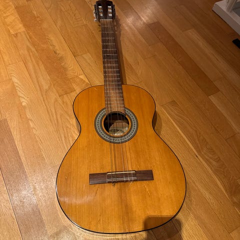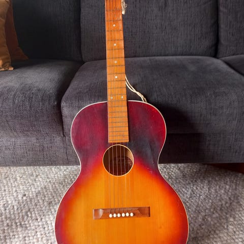 Ukjent merke. Mangler strenger. Inkludert «gitarkasse» i kraftig lærret/håndtak i skinn og kursbrev fra riktig gamle dager😅 Ble en gang gitt en prisantydning på 2000,- for pakken, men har ingen anelse hva prisen bør være😂