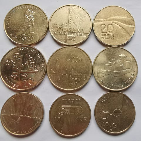 Minnemynter, Posten skal fram, 1647 - 1997 valør fem kr, 1997, to stk av Akershus 700 år valør 20 kr, 1999 og Fram over Polhavet fra 1996 med valør fem kr.